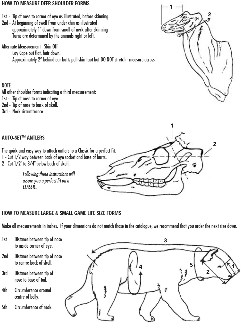 Information on how to measure for forms, links to other guides and associations. Canadian Taxidermist Associationhttps://www.canadiantaxidermistsassociation.com/United Taxidermist Associationhttps://unitedtaxidermyassociation.com/Taxidermy Todayhttps://www.taxidermytoday.com/ Download or Print Guide