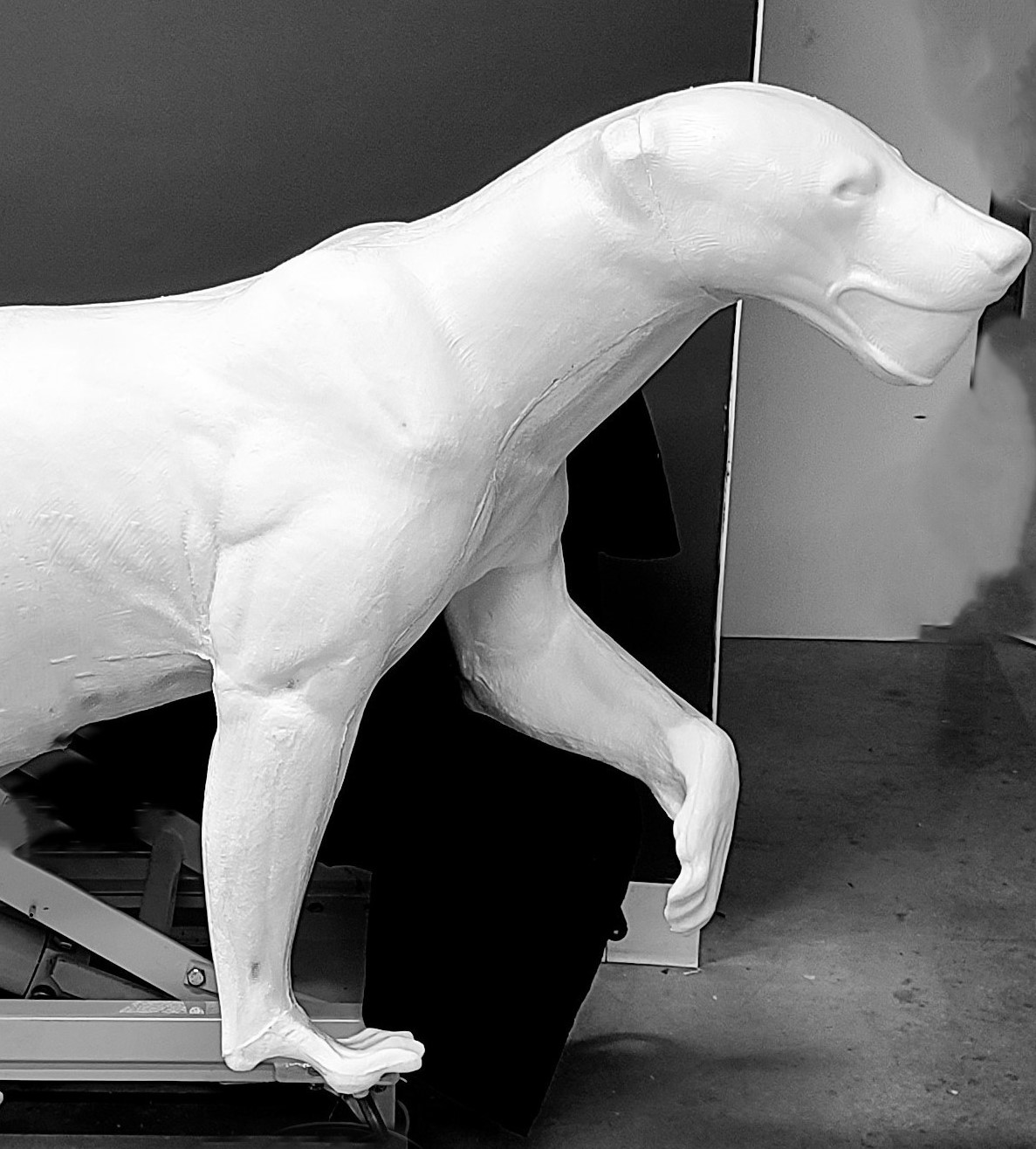 Half life size. Walking one foot raised, R.T., O.M.
