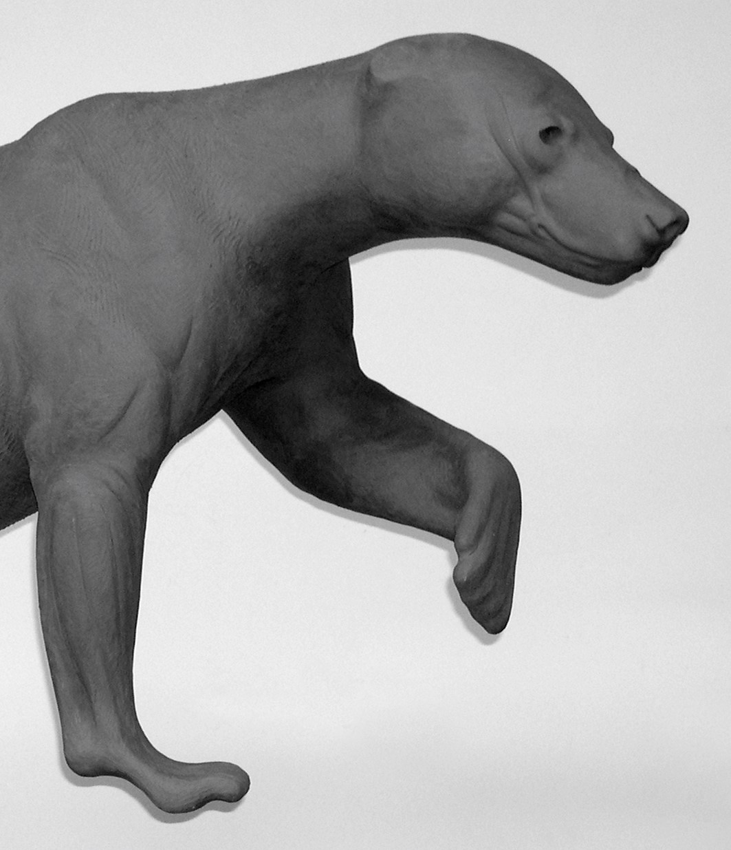 Half life size. Walking up grade, left front paw off ground, R.T., C.M. |