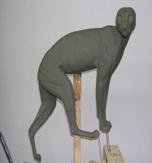 Standing, front elevated, right hind leg stepping up, R.T., C.M. |