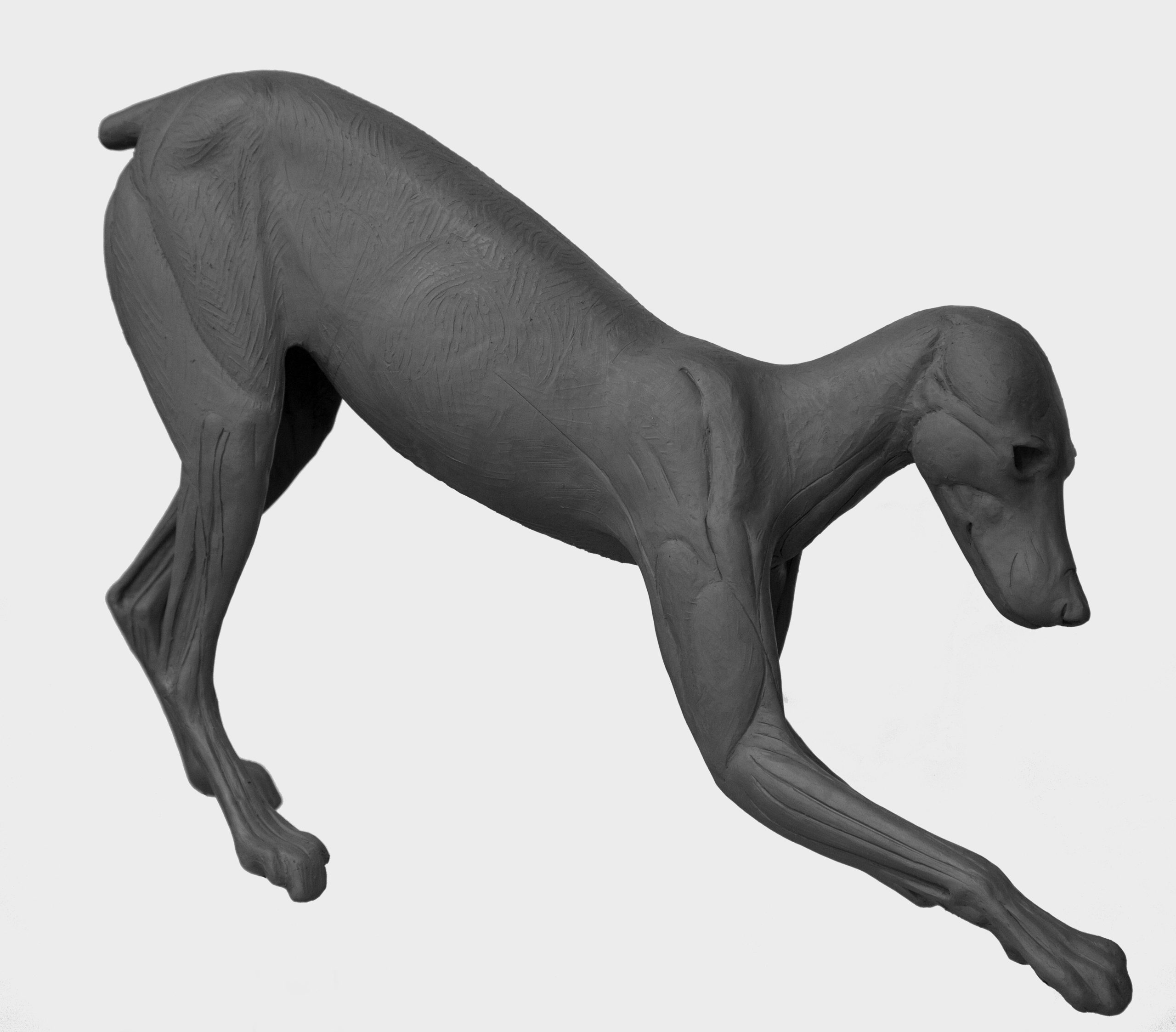 Front paws stretched out holding prey, hind end elevated, C.M.
